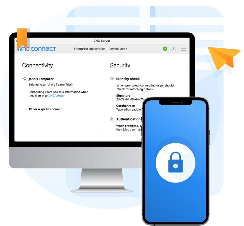 RealVNC Connect 具有企业级安全性,可抵御外部威胁。我们将每个连接视为源自恶意环境。为防止未经请求的访问,传入连接必须始终获得最终用户设备的授权。为确保完全隐私,会话始终采用高达 256 位 AES 的端到端加密。
